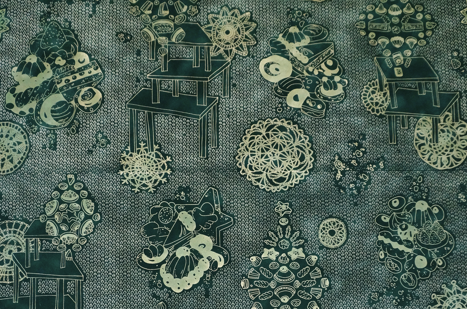 In Kooperation mit der international gefeierten Berliner Künstlergruppe Klub7 sind die Motive für den Berliner Jungel und Kaffeeklatsch entstanden. Auf handgespachteltem, metallischem Grund leben exotische Pflanzen, Früchte, Vögel und Insekten in einem dichten pastellfarbenen Dschungel. Duftende Törtchen aus alten Berliner Konditoreien und Spitzendeckchen geben sich ein Stelldichein auf samtigen Untergründen.