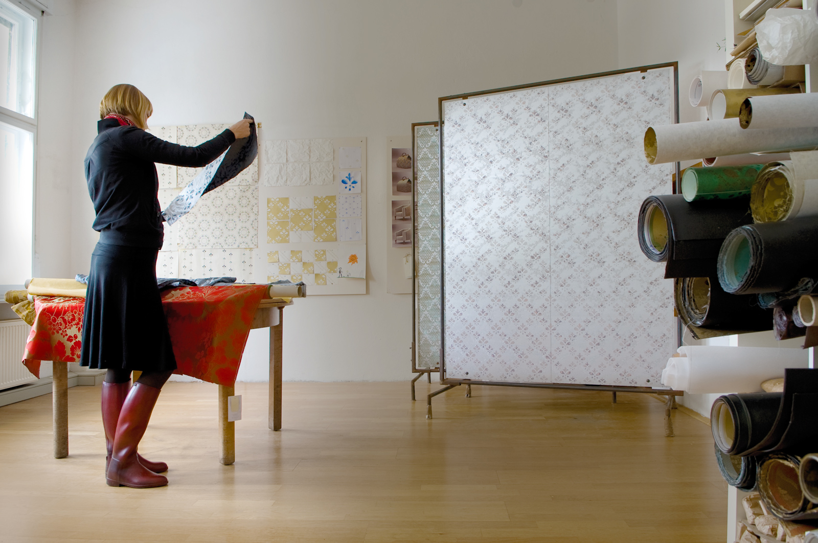 In eigener Siebdruckwerkstatt, an einem 5m langen manuellen Rapportdrucktisch entwirft Textildesignerin Susan Krieger seit 10 Jahren Tapeten und Wandbilder, die von alten Handwerkstechniken inspiriert sind. Dabei spielt das Thema die Schönheit einer Patina eine zentrale Rolle und zieht sich wie ein roter Faden durch alle Kollektionen. Jede Tapetenbahn und jedes Wandbild wird erst auf Kundenwunsch angefertigt.